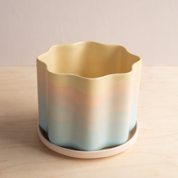 Bring color and style to your indoor garden with this large handmade planter from Peaches Studio. Each planter features a wavy profile design and stunning ombre look. Colors transition from blue to peach to yellow, finished with a high-gloss clear glaze for a vibrant, polished look. A matching drainage dish is included to protect surfaces and support healthy plants.