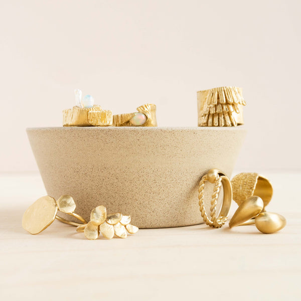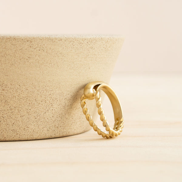 Handmade brass ring with half brushed brass band and half rope-textured band. Size 8. Made in New York by 8.6.4.