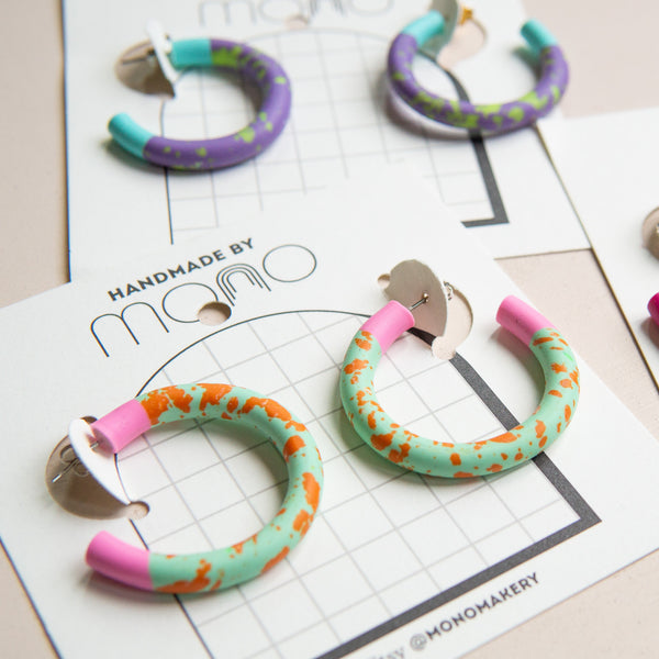 Handmade speckled hoop earrings, crafted from lightweight polymer clay with nickel- and lead-free posts. Fun, unique, and made in Belgium.