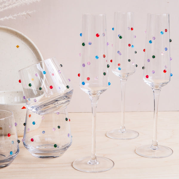 Celebrate in style with this party-ready champagne glass. Featuring vibrant, confetti-colored beads, this festive glass brings a playful pop to birthdays, parties, and any special moment worth toasting. Pair with our confetti beaded wine glass.
