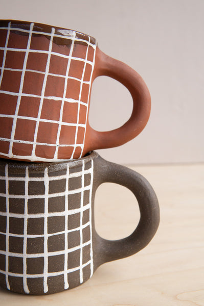 Add modern style to your everyday ritual with this handmade ceramic mug from Melville Ceramics. Crafted in chocolate or red clay, each mug features hand-painted white underglaze lines forming a minimalist grid design. The exterior is left raw for a natural, tactile feel, while the interior and lip are coated in clear glaze for a smooth finish.Though dishwasher safe, handwashing is recommended for more delicate care. Each mug is a unique, one-of-a-kind piece, handmade in Durham, North Carolina.