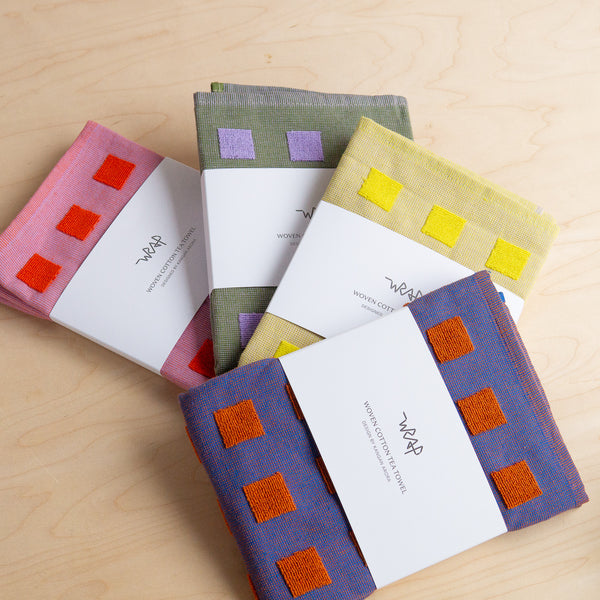 A graphic two-color dish towel designed by Kangan Arora, woven on a traditional jacquard loom from 100% cotton. The design features raised terry squares that add both texture and absorbency. Offered in 4 color combinations, each tea towel measures 20 × 27 inches. Made in Portugal from woven cotton and sold in packs of six.
