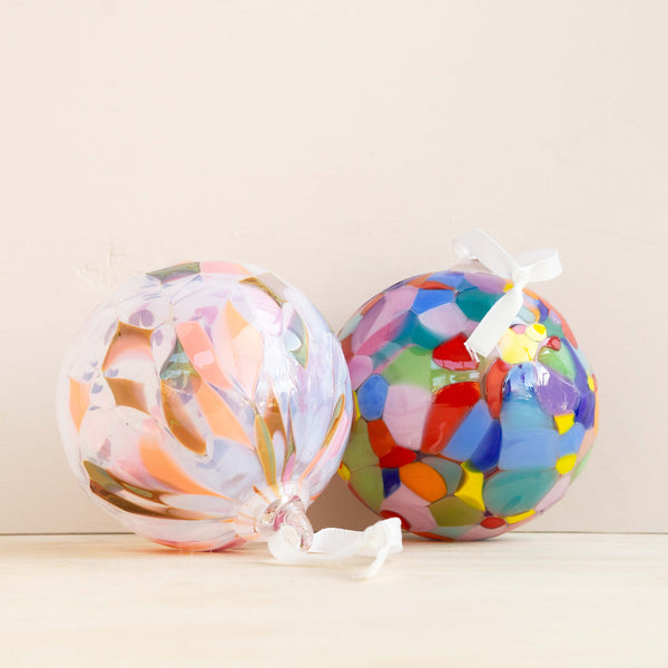 One of a kind handblown glass ornament, made in Vancouver BC. Measures approximately 4" in diameter. Finished with a ribbon for hanging. By Maria Ida Designs. Each ornament sold separately.