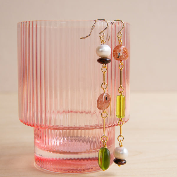 Mismatched dangles of sunstone, pearl, mahogany obsidian and vintage glass, handmade by Michelle Starbuck Designs in Chicago, Il.