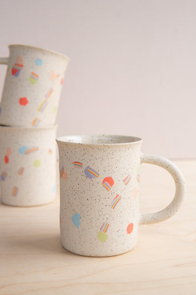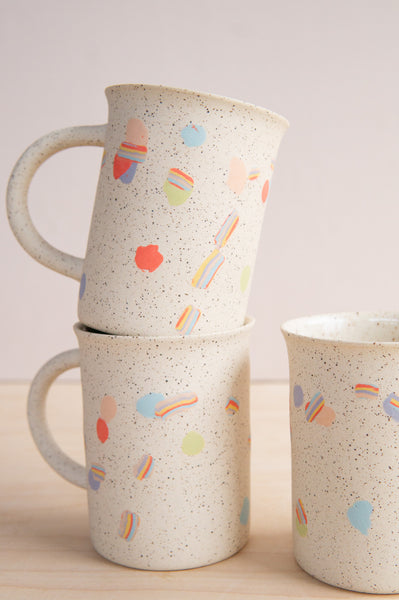 Joyful mugs featuring a creamy speckled clay body accented by vibrant nerikomi details. The flared rim and comfy handle make for easy sipping while a clear glazed interior offers a smooth finish. Handmade in Portland, OR by Peaches Studio.