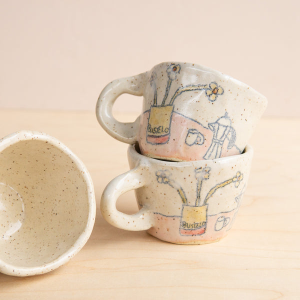 Perfectly sized for espressos or shots, these little pinched logo cups are as whimsical as they are practical. Each is one-of-a-kind and handmade by Noah and Sasha of Juice Ceramics in Jacksonville, FL.